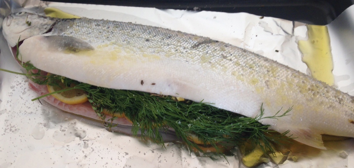 Steve Hatt cleaned the sea trout for me, so it took me just a couple of minutes to prepare it. It weighed about 2 kilos so I cooked it for an hour. A smaller fish will take less time.