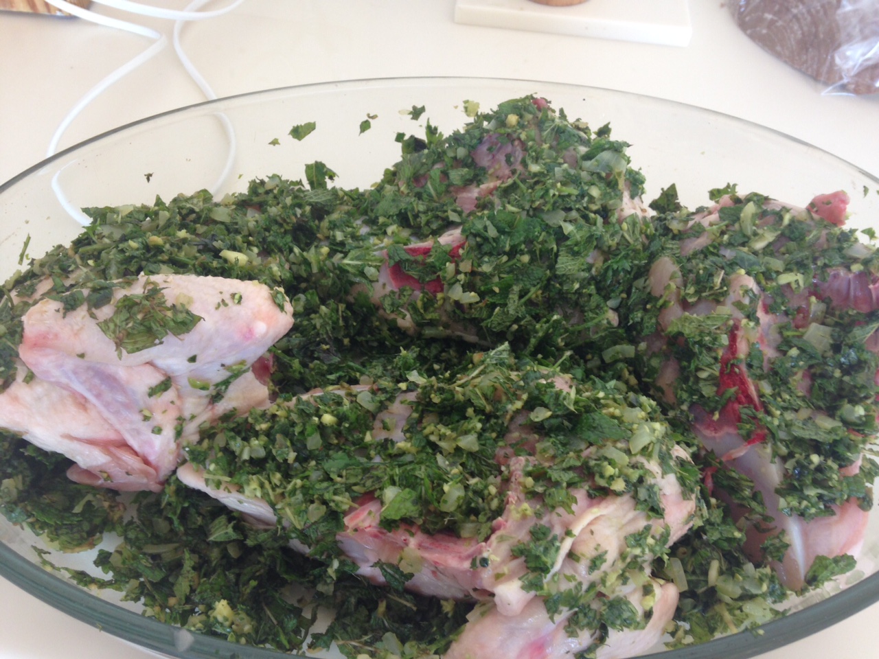 The experiment turned out rather well, even if I say so myself. (Actually, Bruno, Sean and David also said so). It takes quite a lot of prep so if you’re looking for a quick meal, this is not for you. But if you’re looking for an afternoon in the company of the lovely smells and colours of mint, coriander and spices, here you go….