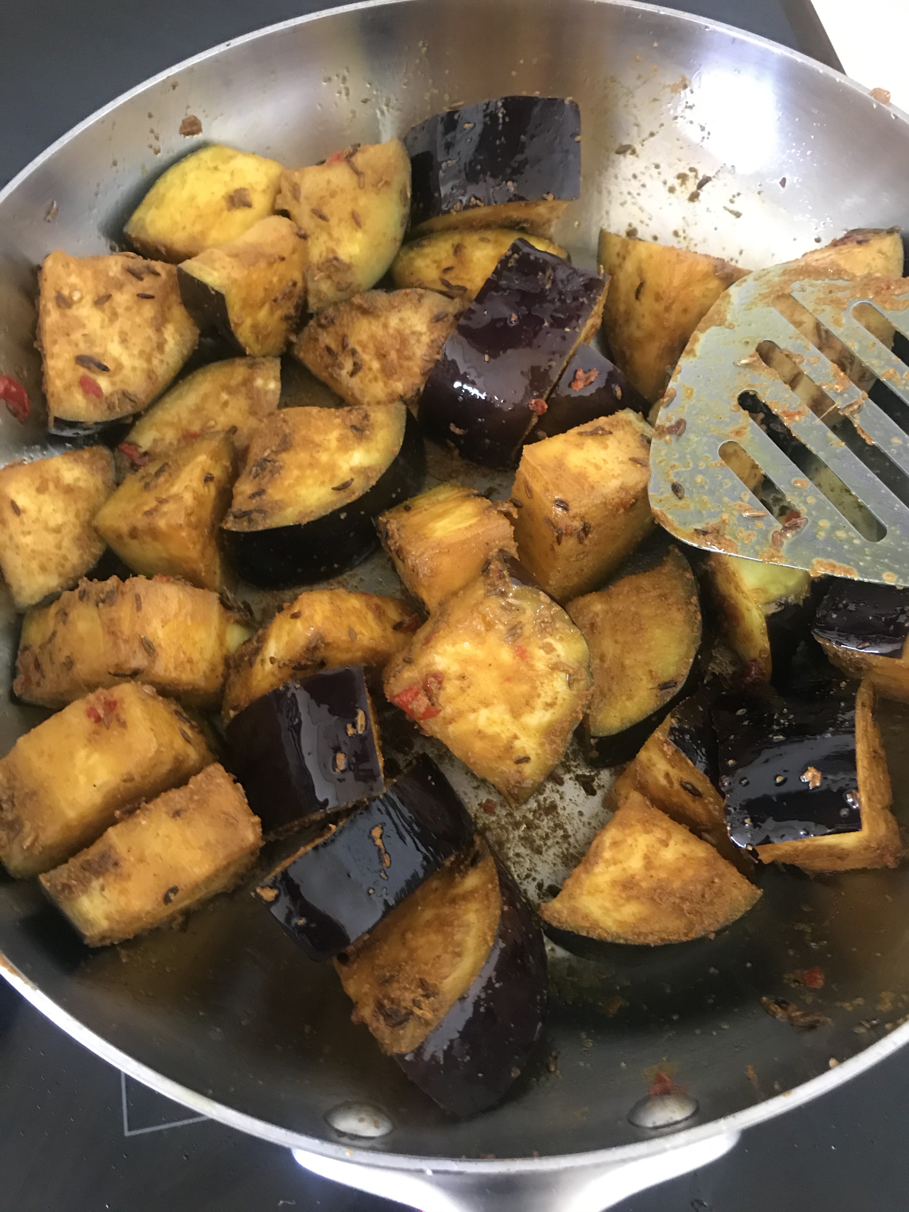 Kay’s Covid Cookery Class No 16. (Slightly too spicy) aubergine and lentil stew.
